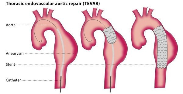 If the thoracic aneurysm was caused by trauma, such as if the patient was in an accident, TEVAR is a way to rapidly cover the injured area, controlling bleeding and preventing death.